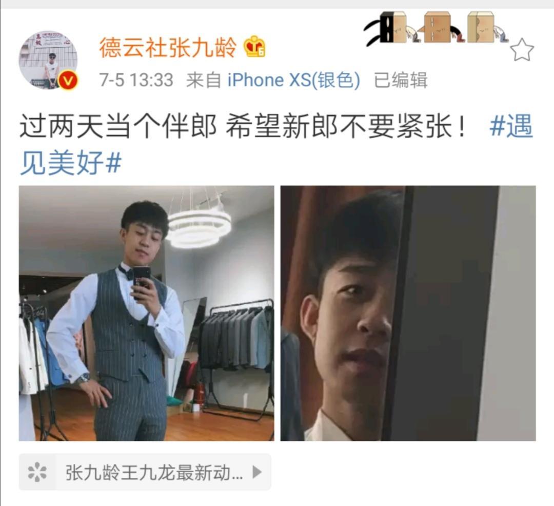 德云社喜事连连,单位有喜事大动作不断,录综艺拍剧,风生水起。个人也有喜事,张九龄发微博要当伴郎了。