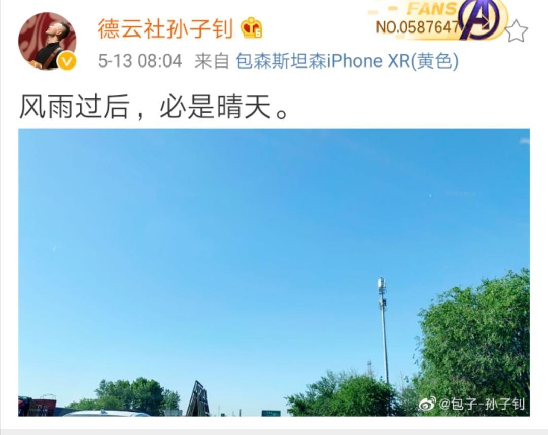 5月13日,孙子钊发的微博,风雨过后必是晴天,说得很好,一起走花路的同路人,觉得很温暖。