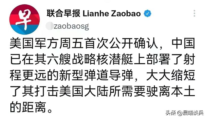11月19号,新加坡联合早报称,11月18号,美方军方首次公开称,中方已经在其6艘战略核潜艇上部署了射程更远的新型弹道导弹,大大缩短了其打击美方本土所需要驶离本土的距离。