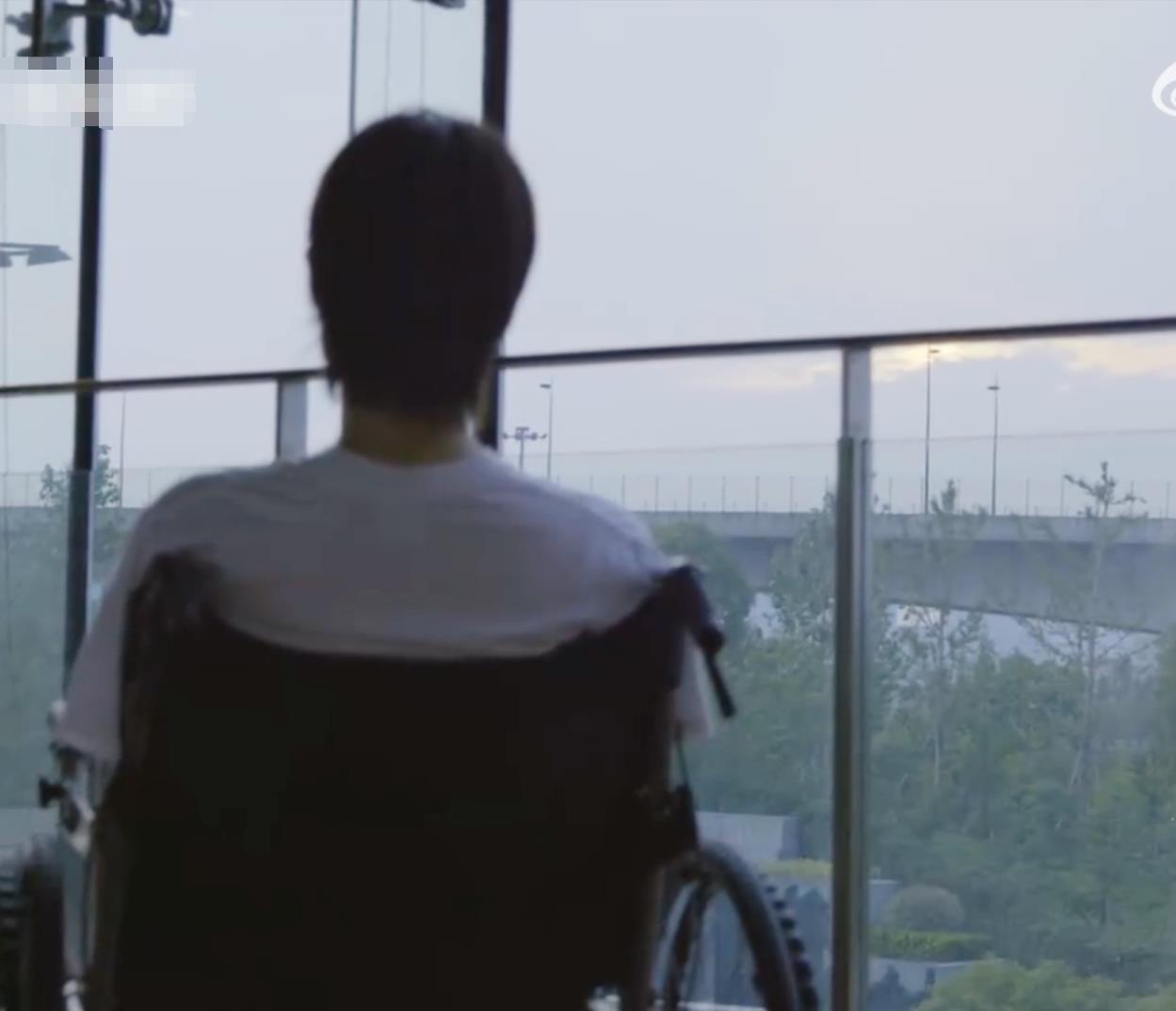 两手搭着轮椅扶手,脸部有些臃肿,