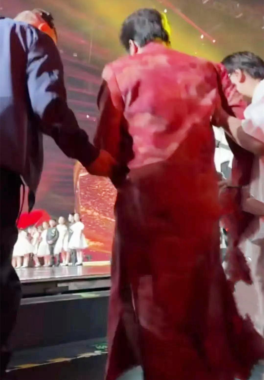 44岁的李玉刚,一袭红色长衫,万万没想到的是,他居然是被助理工作人员推着轮椅现身后台的。