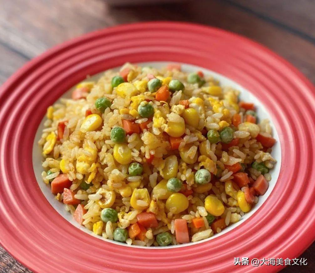 步骤二:将昨晚吃剩下的两碗大米饭盛出,锅中倒入适量的食用油,油开之后转小火,下入玉米粒火腿肠丁豌豆翻炒,下入大米饭一起翻炒,打入一个鸡蛋进入锅中翻炒。