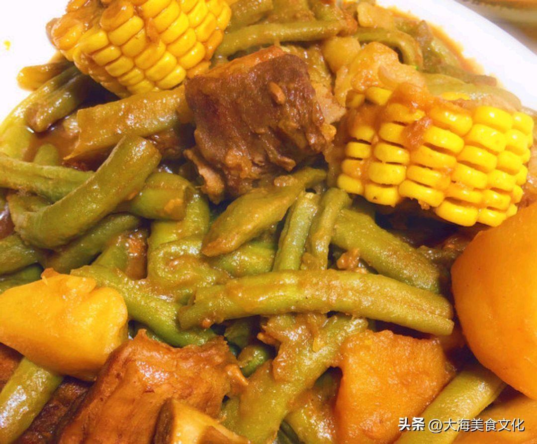 步骤二:锅中烧热水水开下入排骨煮熟捞出,锅中烧热油,油开之后转小火,下入土豆块和豆角翻炒,炒到5成熟的时候,加入足够多的清水和排骨,没过食材。下入玉米块和食用盐,酱油,一起中小火炖煮30分钟,让它们成熟。