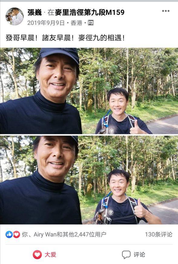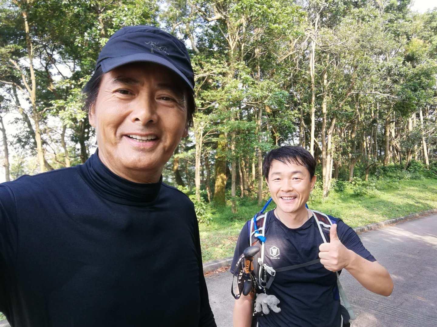 在我眼里和众多喜爱发哥的人一样,发哥绝对就是神一样的存在,在香港,这个明星之都,偶遇野生捕获发哥绝对是市民粉丝们内心期盼的,在我们香港徒步爱好者(山友)群组里惯常讲的一句话就是:“行的山多,必遇发哥”,发哥同样是香港山友界的一面旗帜和绝对亲民的男神,之所以成为香港麦理浩径40周年的形象大师也是因为发哥钟爱香港的郊野山林并身体力行喜欢行山徒步运动,如果在行山途中偶遇发哥,山友就会第一时间在脸书群组里扑出图片,并且第一时间大大的炫耀一番,如同中了六合彩那样的一桩喜事。缘分来了挡都挡不住,与发哥偶遇郊野的美事终于被我撞到了,旧年秋天九月,麦里浩径第九段我起步不久,在第一个弯道下坡路先遇到正在缓跑上坡的刘嘉玲,“玲姐早上”!我挥手并问道,“早上”,玲姐回应到,刘嘉玲和发哥是山友,经常结伴行山,我窃喜要中彩!果然一个熟悉的身影在前方200米不远处缓缓跑来,“发哥”我心理想着,嘴里轻轻念叨着,在停步仔细端详之后确认果然就是期待偶遇已久的发哥,我立在路旁,发哥近了,缓跑并轻轻的急促的呼吸,“发哥,早上”,他笑了,没有停下脚步,用粤语回应到“早上早上”,“周一吖,係咪唔使做?! ”,多么贴地的家常话啊,在香港通常打工仔是手停口停的,周一不返工来徒步怎么可以?我笑了,“周一休息唔使返工喎”,我转身在发哥身后陪着缓跑到了坡顶,停步,应我的请求来张期待中的合影了,发哥的惯例招牌动作拍下了我可以一直炫耀的这张合影了,拍摄完毕,还了我的华为手机,发哥用普通话问我了,“你家乡是哪里啊?”,我打招呼尽管是粤语,但必然是带有浓浓的口音的,发哥的问话让我莫名有些感动,“发哥,我是山东青岛人”,“青岛?太漂亮了,青岛啤酒!那么远的来走麦里浩啊”,“我人现在香港,我喜欢徒步,喜欢麦理浩径”,“还要走一个钟的,加油吧”,我们就此挥手告别,这就是人生中的莫名的缘分,从上海滩、英雄本色、赌神再到让子弹飞,追了发哥这么多年,竟然可以在一个阳光明媚天清气朗的秋日早晨香港的郊野公园的徒步道相遇,我是幸运的,和脸书的山友一同分享我此刻的快乐是必须的标准程序,告知大家与发哥可以偶遇的下个节点,开心的我一路走落下去,路很远但我没有感到丝毫的疲累,这是一个美好的早晨,这是一座美丽温情的都市,我爱发哥!我爱香港!