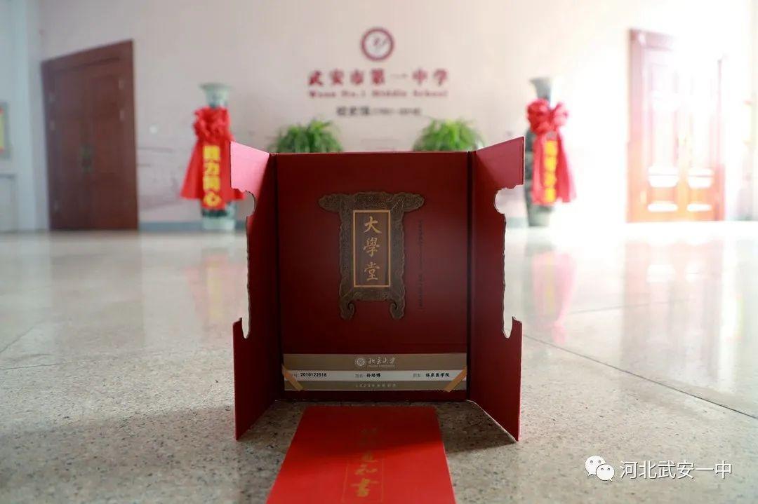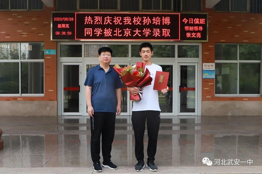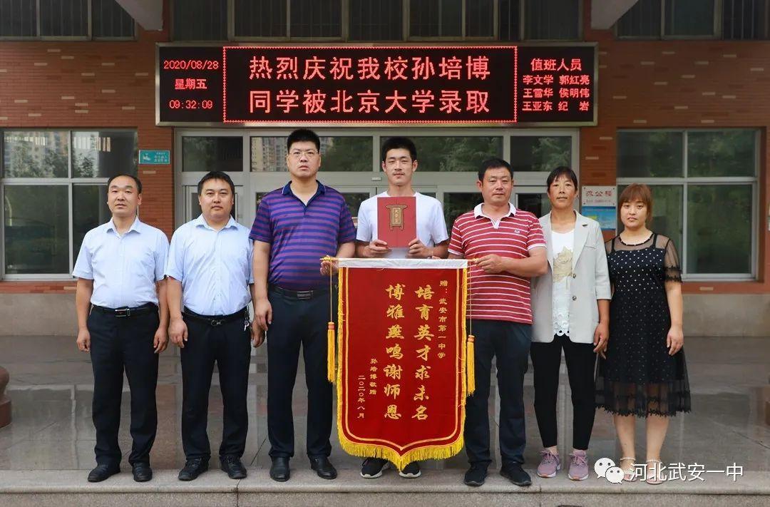 孙培博及家人向母校武安一中和恩师们献上锦旗,“培育英才求未名,博雅燕鸣谢师恩”,这14字饱含了孙培博对母校和恩师培养的感激之情,对母校武安一中的深深眷恋以及对北京大学未来求学生活的无限憧憬。