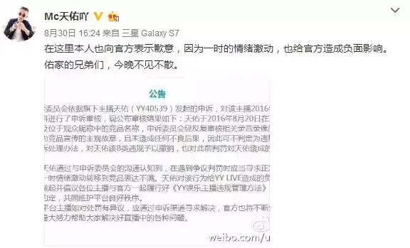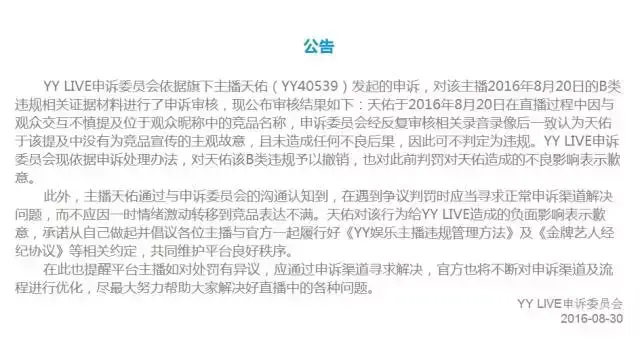 YY发出正式公告,撤消天佑B类违规处罚,并向天佑本人表示歉意