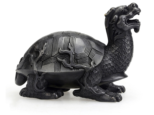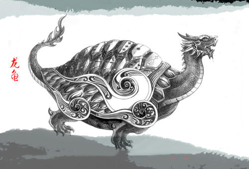 龙龟,相传为古代神龙所生之子,背负河图洛书,揭显天地之数,物一太极,上通天文,下知地理,中和人世。龙龟是龙神和灵龟的化身。明杨慎《升庵外集》有云:“传说龙生九子,龙不成龙各有所好:一曰赑屃,形似龟,好负重,今石碑下龟趺是也……”由于“赑屃”头为龙,身为龟,所以民间又称之为“龙龟”。