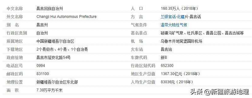 昌吉回族自治州,简称“昌吉州”,隶属于新疆维吾尔自治区,地处天山北麓,准噶尔盆地东南缘,地势南高北低,由东南向西北倾斜,属中温带区,为典型的大陆性干旱气候;总面积7.39万平方千米,辖2个县级市、4个县、1个自治县;2017年总人口140.6万人。