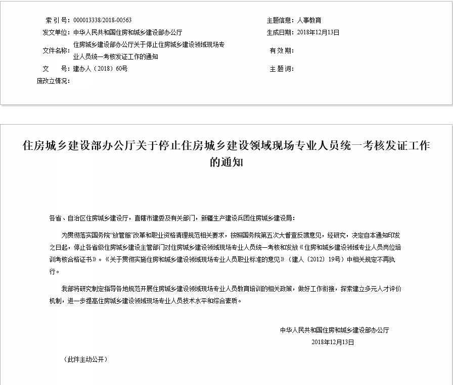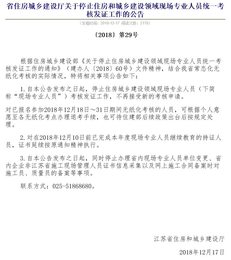 紧接着,12月17日,江苏住建厅发布了《关于停止住房和城乡建设领域现场专业人员统一考核发证工作的公告》
