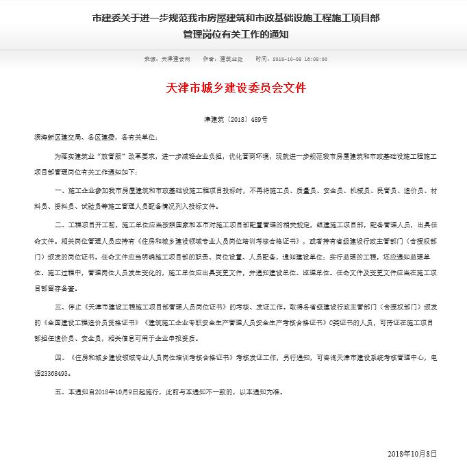 另外,早在今年的10月8日,天津住建委就提前做好了规划,下发了《市建委关于进一步规范我市房屋建筑和市政基础设施建设工程施工项目部管理岗位有关工作的通知》(津建筑[2018]489号):