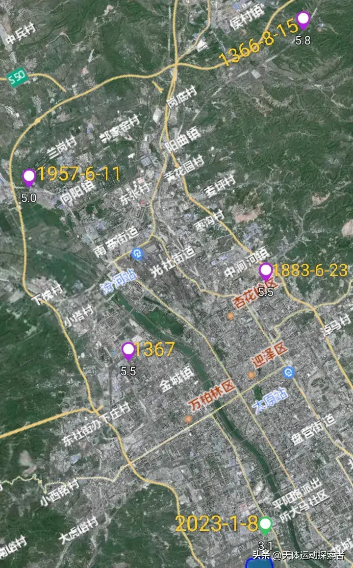 1367年太原市金城镇一带5.5级距清徐县3.7级震中40公里左右
