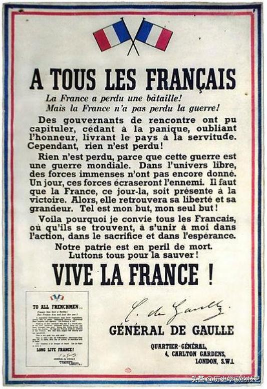 1940年6月18日18时,戴高乐坐在英国广播电台的播音室里,向全世界、也向沦亡的法国,发表了具有历史意义的“六·一八”演说。戴高乐郑重宣告:我,戴高乐将军,现在在伦敦。我向正在英国领土上和将来可能来到英国领土上的持有武器或没有武器的法国官兵发出号召,向目前正在英国领土上和将来可能来到英国领土上的一切军火工厂的工程师和技术工人发出号召,请你们和我取得联系。戴高乐指出:无论发生什么情况,法兰西抵抗的火焰不应该熄灭,也绝不会熄灭!就这样,戴高乐在海峡彼岸的伦敦,树起了第一面法国反抗德国法西斯的旗帜。这次演说,标志着“自由法国”运动的开始。