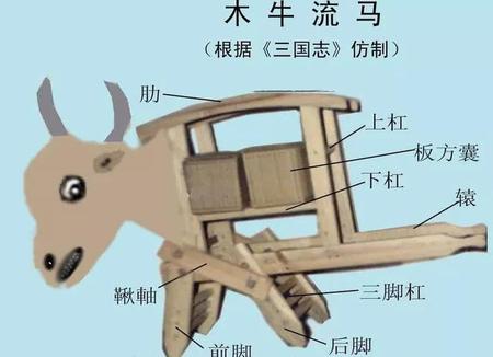 木牛:四轮车的车厢上装上牛头,双辕装上前、后撑杆轴,长短撑杆铰接在撑杆轴上,双辕再铰接在车体上,摇动双辕撑杆撑地而促使车轮转动。