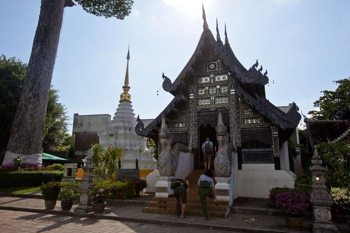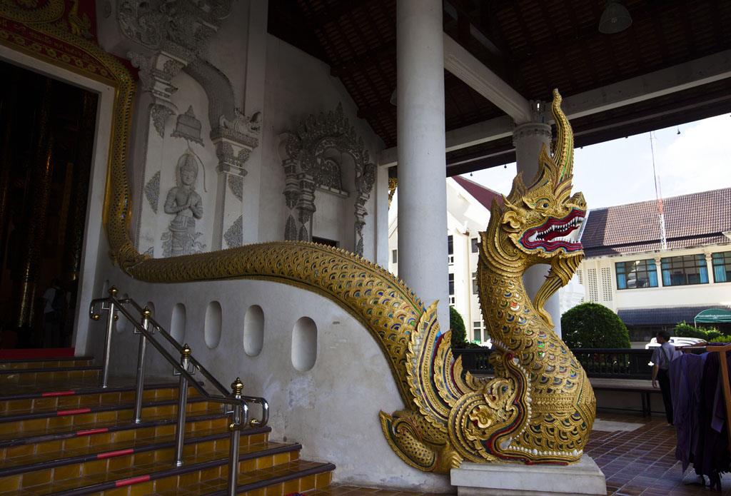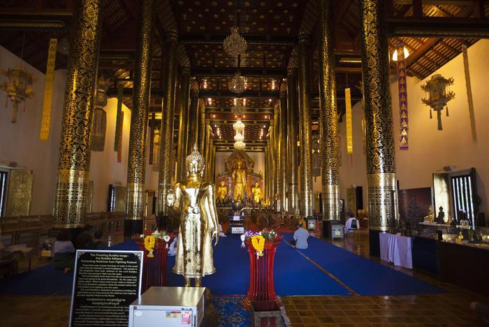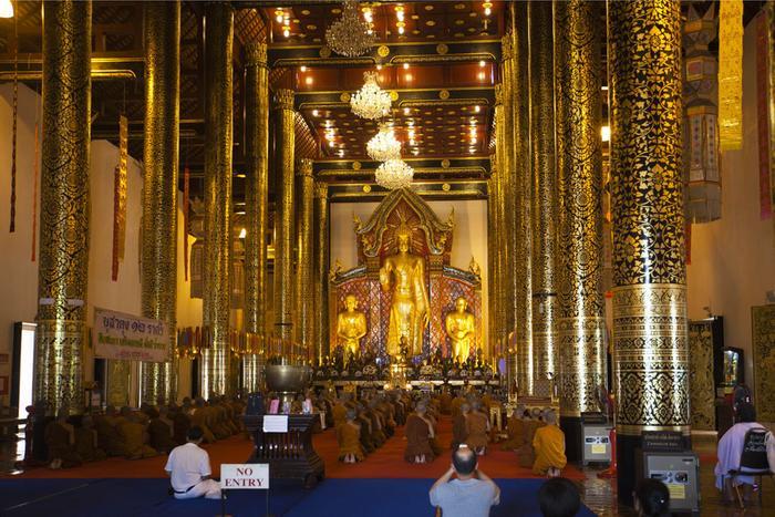 契迪龙寺属于典型古泰王朝时期的兰纳建筑风格,由主殿、小佛殿、僧房等组成。寺庙门口点缀着蛇和孔雀的装饰,进入内部则能看到巨大的佛像。
