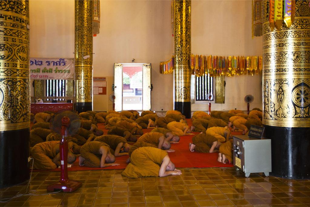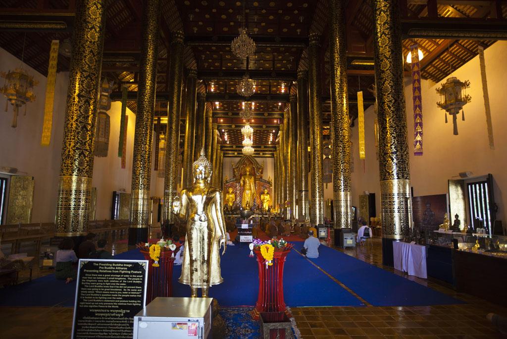 契迪龙寺除了大佛塔外,还有两座殿堂。在每座殿堂中间的玻璃橱中端坐着身披迦裟的高僧的蜡像,栩栩如生。在泰国进入寺庙的大殿前,必须要在门口脱鞋,衣着要整齐,也不能太暴露,不少寺庙内是不允许拍照的,这也体现了对佛教神殿的尊重。