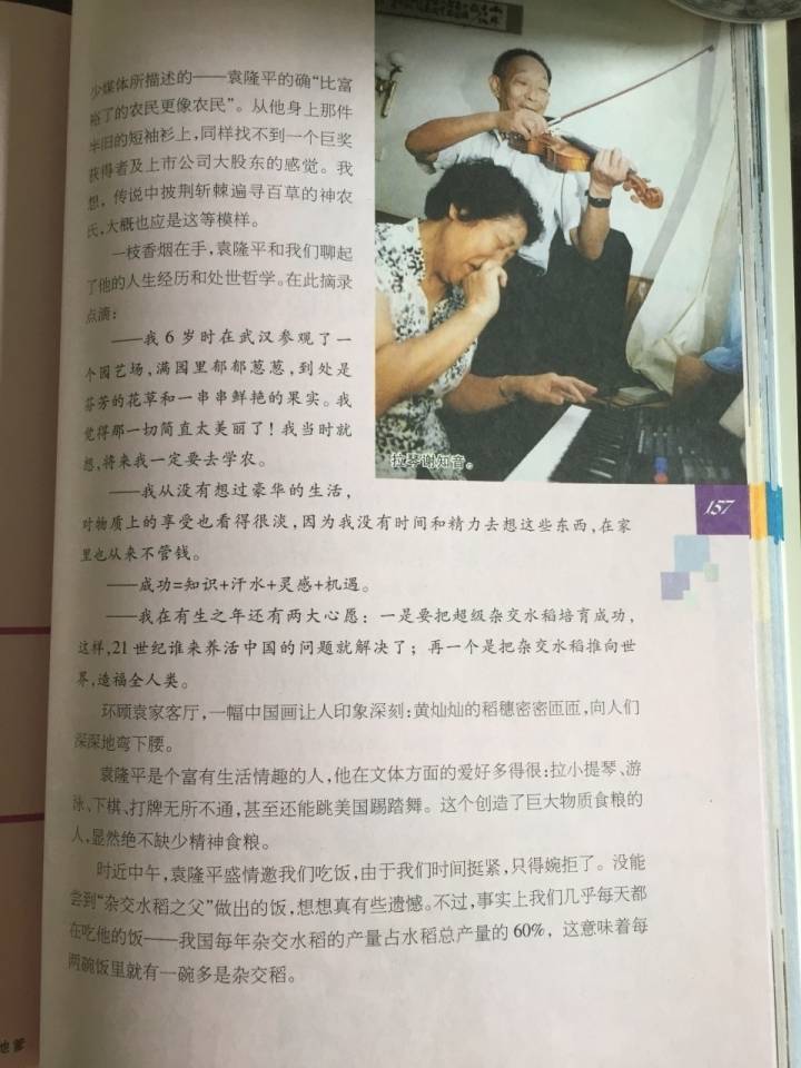 但在精神生活上,袁隆平还是有着不少追求的,也很有生活情趣,并非一个乏味无趣的人。在采访期间,袁隆平当着张亮和牛群的面,拉起了心爱的小提琴;空闲时,他还喜欢和大家一起打打牌……