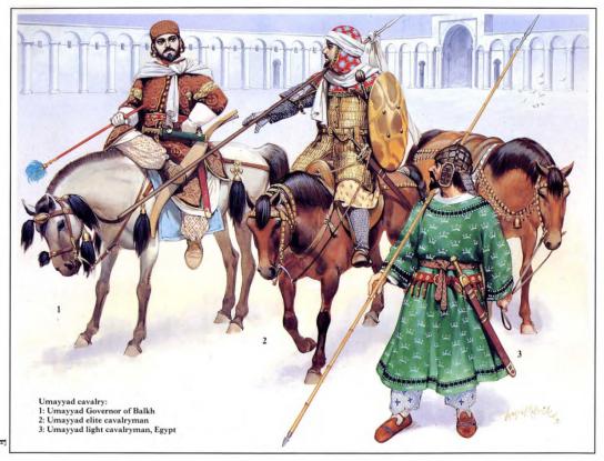阿拉伯战士的防护装备主要有头顶的“拜达盔”(Bayda,就是卵形盔),和“米格法尔”(mighfar)锁子甲背心,下半身明显缺乏防护。就这种水平的防护还只是极少数土豪战士才有的专利,八世纪初阿拉伯人将5万大军投入到中亚时,全军只有三百五十件锁子甲。而拜占庭帝国和波斯帝国都有人马具装的重装骑兵部队,披甲率也远远超出。