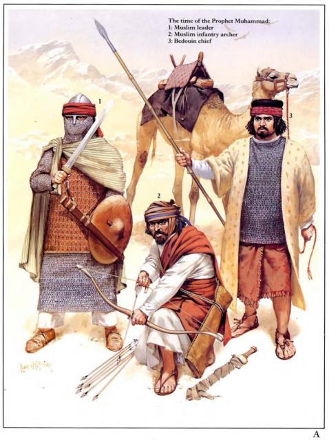 当时的阿拉伯军人主要武器是矛,步兵使用砍杀、刺杀两用的“鲁姆赫”(rumh)长矛,骑兵使用较短的“哈尔巴”(harba)矛;只有部分精英战士可以使用代代相传的阿拉伯剑,弯刀这种武器可不是他们的传统兵器,当时的诗歌称赞的都是英雄手中的宝剑。