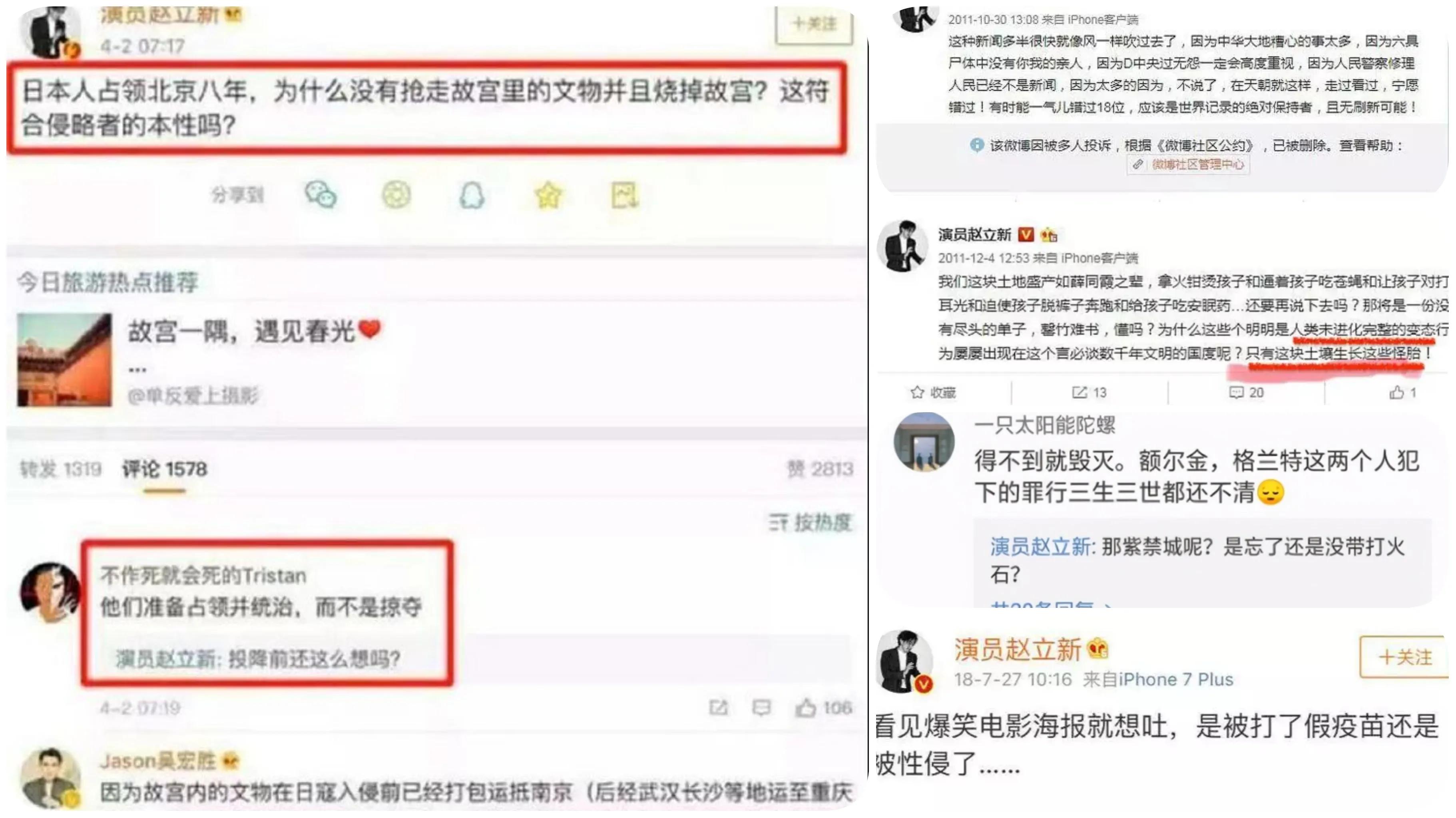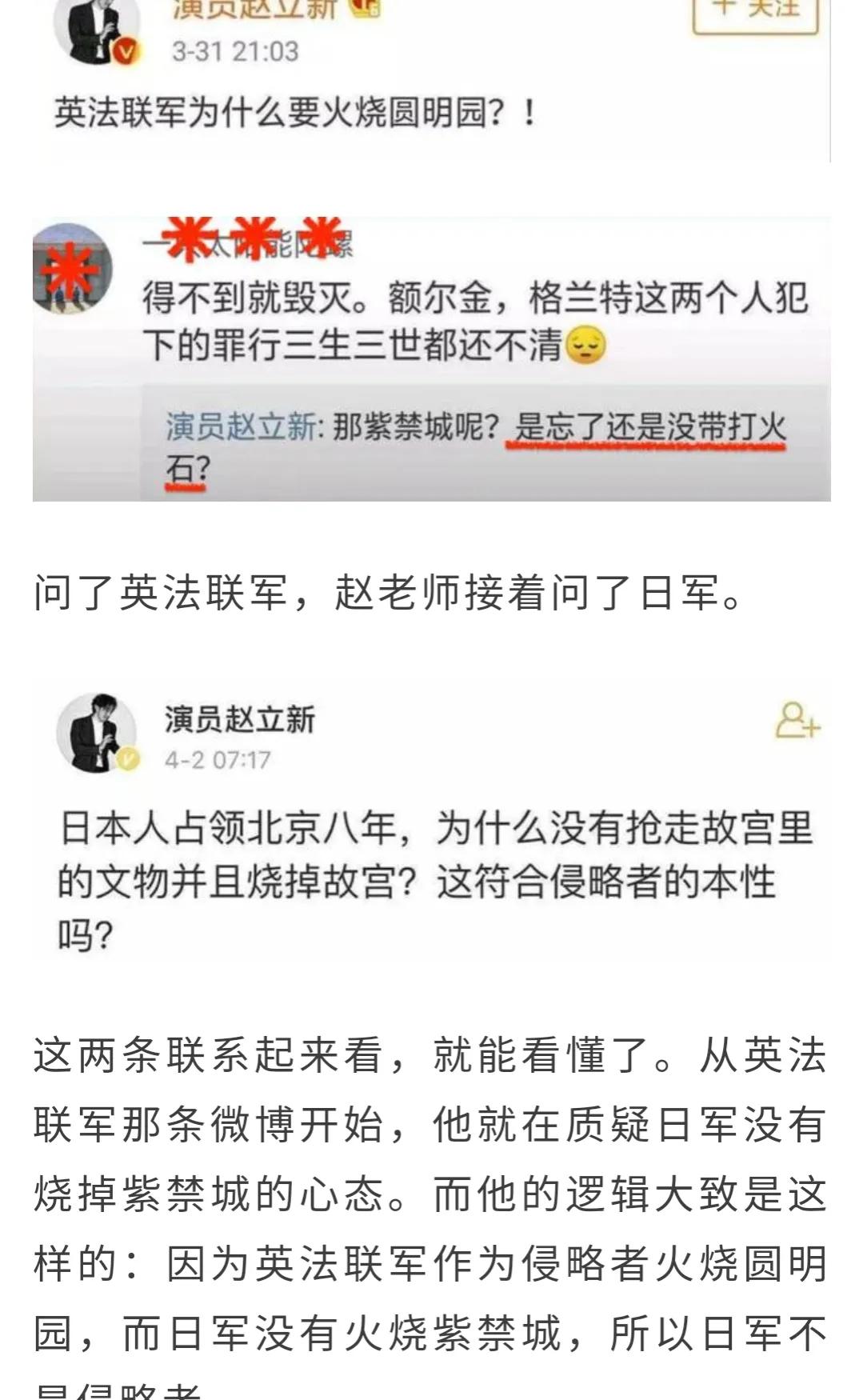 失德艺人瑞典籍演员赵立新在社交媒体上发布有关日本人占领北京,却没有抢走故宫文物并烧掉故宫文物。他认为这似乎并不符合侵略者本性反而为日本人做辩护为侵略者洗白!