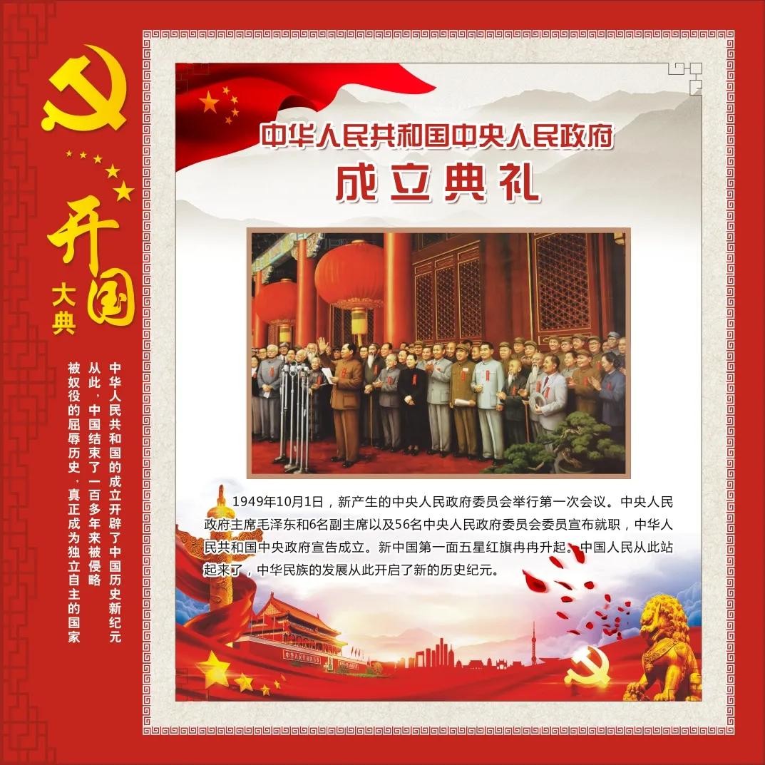 - 开国大典:1949年10月1日,毛泽东在天安门城楼上向全世界庄严宣告中华人民共和国中央人民政府成立,标志着中国人民从此站起来了,中国历史进入了新纪元。