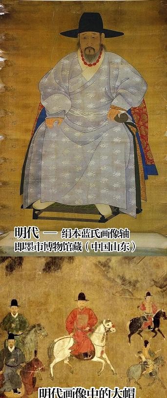 第二个是中国明朝时期的一幅鲁王墓出土的人物画像,有清晰的大帽实物,并且在山东博物馆能够找到,相信“古人不会欺我”。
