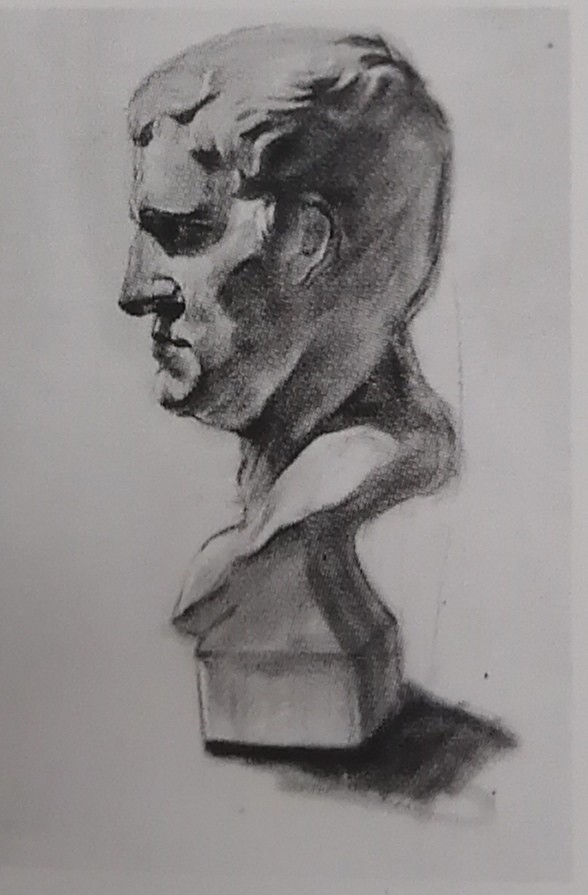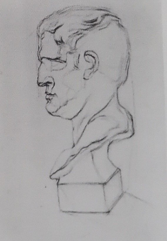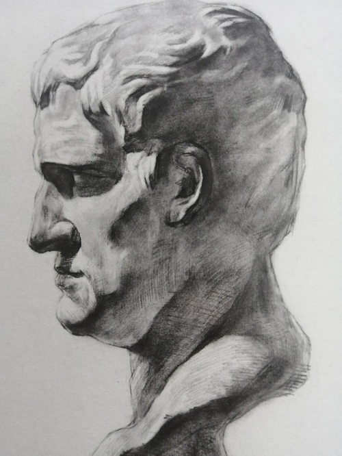 1:构图,认真观察石膏像,根据石膏像的朝向确定左右的位置,以及画面的构图,比例。然后对头,颈,胸,底座的比例和动态进行概括。