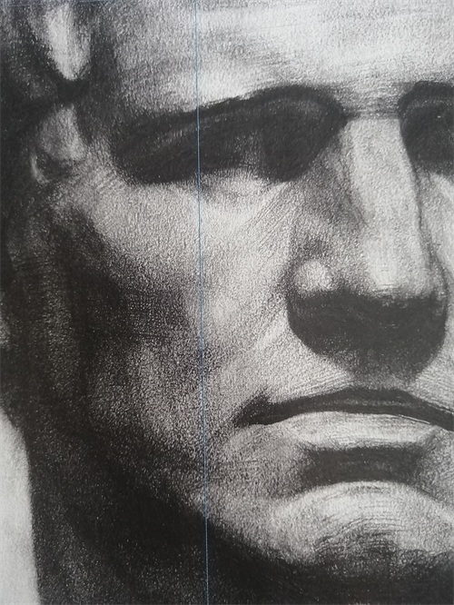 1:石膏像五官需要深入刻画,注意明暗交界线是依附在形体结构上变化的,深入刻画时要注意虚实和节奏的把握。注意五官和面部转折的强弱关系,五官对比强,面部对比弱,骨点位置适当加强,注意人物脸部结构的表现,每个块面的表现都应该注意轻重以及周围结构的穿插关系。
