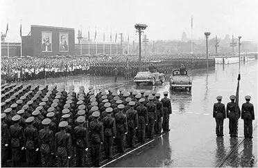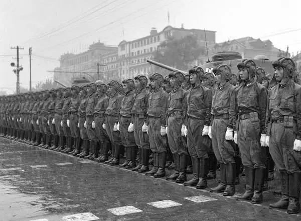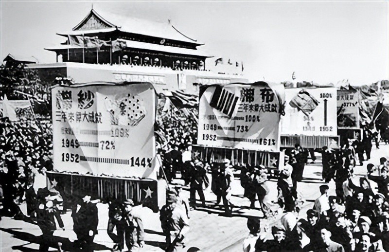 1952年国庆阅兵,展现的是武器力量,解放军坦克部队铁流滚滚,公安部队和少数民族民兵大队首次参加阅兵,人民群众举牌游行,庆祝国民经济恢复任务完成。