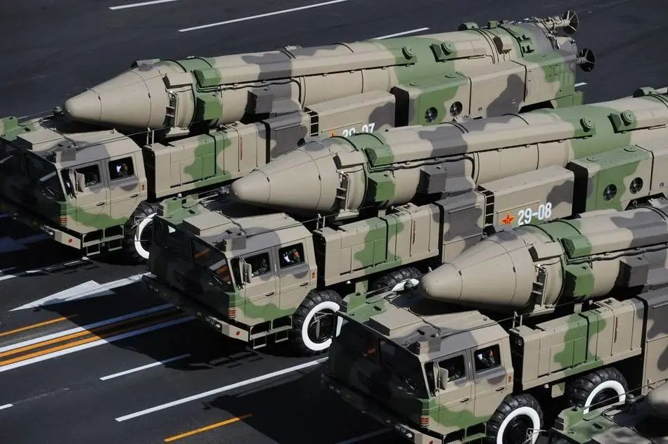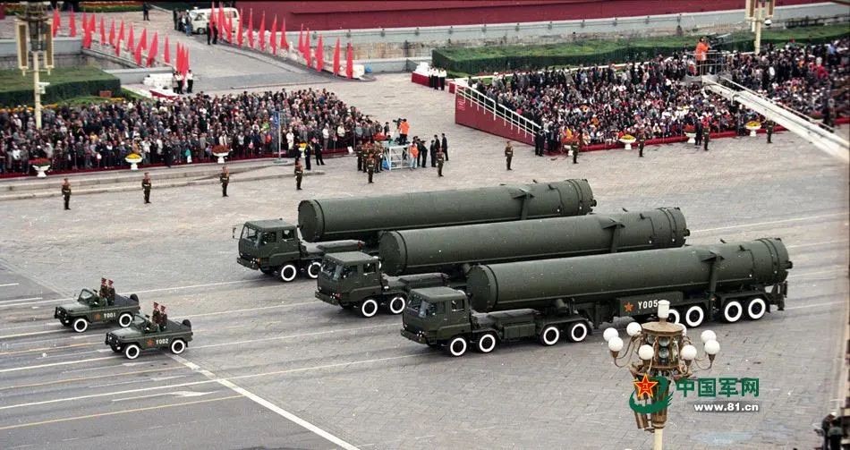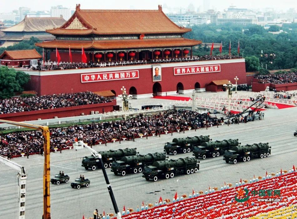 这次建国五十周年大阅兵,海陆空三军航空兵比翼齐飞,中程地地核导弹方队举世瞩目,东风-21弹道导弹震惊世界,