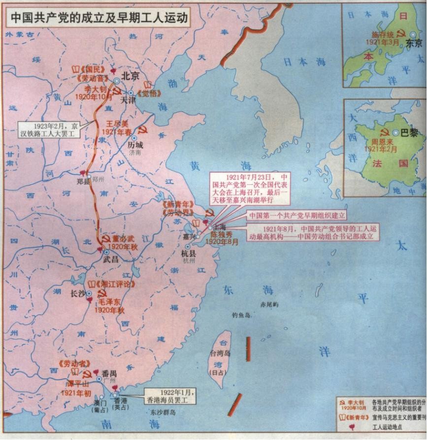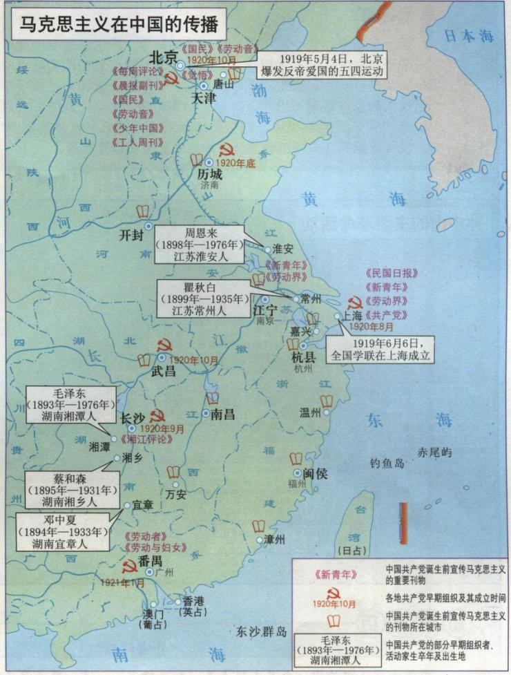 ⑤各地早期共产党组织成立。1920年8月上海陈独秀,10月北京李大钊,还有武昌、长沙、广州等地。