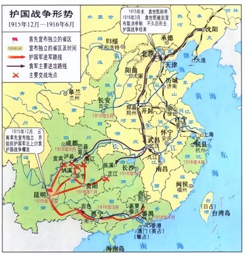 3】经过:在云南宣布独立,组织护国军北上讨袁;不少省份积极响应,相继宣告独立。