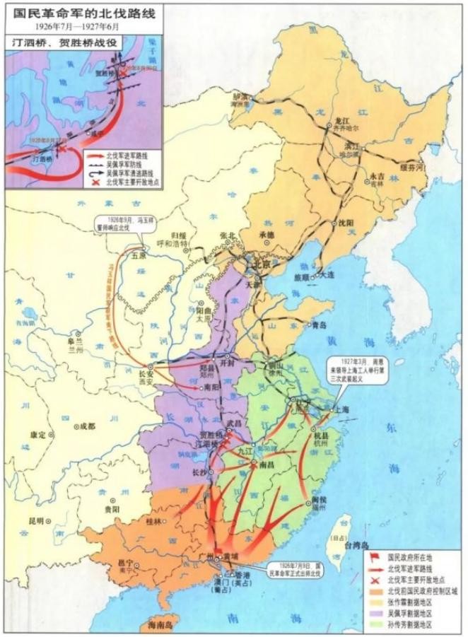 1926年国民革命军誓师北伐,基本消灭吴佩孚、孙传芳两大军阀,革命势力从珠江流域发展到长江流域。