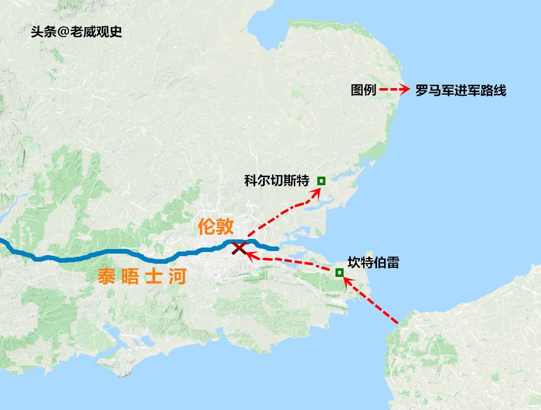布劳迪斯在不列颠东南部登陆,他们遇到的不列颠人其武装与凯撒时期没多大改变,布劳迪斯首先攻打了克诺贝利努斯两个儿子把守的科尔切斯特,双方在泰晤士河南边打响了第一场正面交锋,获胜之后的罗马军团得到了皇帝克劳狄乌斯的亲自慰问。