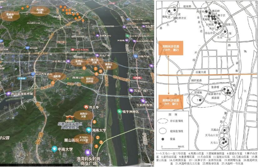 基于“汉代诸侯王夫妇同茔异穴”的分布规律,王和王后的墓一定是在一块的,这个分布规律以及当前发现王陵的整体分布图及数量,同时基于已经发掘陵墓的出土文物,基本可以判定,吴氏长沙王和刘氏长沙王的陵区以岳麓大道为界区分,岳麓大道以南为吴氏长沙王及王室成员墓葬,主要分布在岳麓山一带,数量9个(五代吴姓长沙王)。岳麓大道以北,刘氏长沙王及王室成员墓葬主要分布在谷山一带,数量14个(9代刘姓长沙王,2废),数量也恰好对的上。另外,长沙考古研究说所长何旭红还发现一个有趣地理分布:“长沙有两条重要的河流:一条湘江,一条浏阳河。长沙王身份是诸侯王,他们的陵墓选择在湘江岸边。轪侯利苍的家族墓和爵秩大致与其相当的贵族的墓葬,主要在浏阳河边。身份更高的王的陵墓,占据了更好的地理位置。”