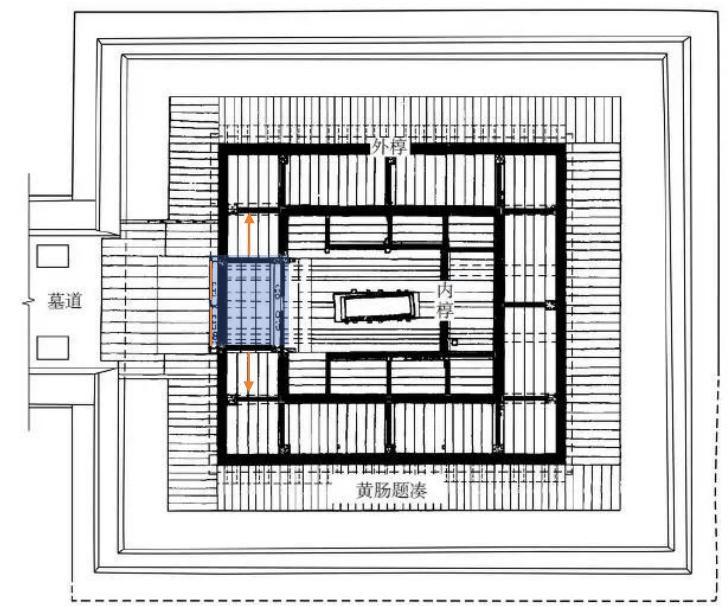 黄肠题凑位于坑壁与外椁之间,紧贴外椁及通道墙板四周,与墓室壁间空隙填充夯打的黄砂土和砾石等。题凑以内的外椁、内椁、棺室形成两处回廊。外椁西墙正中开设双扇门,连接通道与前室。前室四面皆通,西接通道,东连内椁室,南北分别通向内、外椁之间的回廊,该回廊由立柱、隔板、门扉、横梁等将其隔互通且独立十二间小房间。由前室经内椁门通往内椁室,内椁墙板与棺室墙板间的空间为另一处回廊,除开设内椁门的西边外,其余三边被分隔为五处小空间。