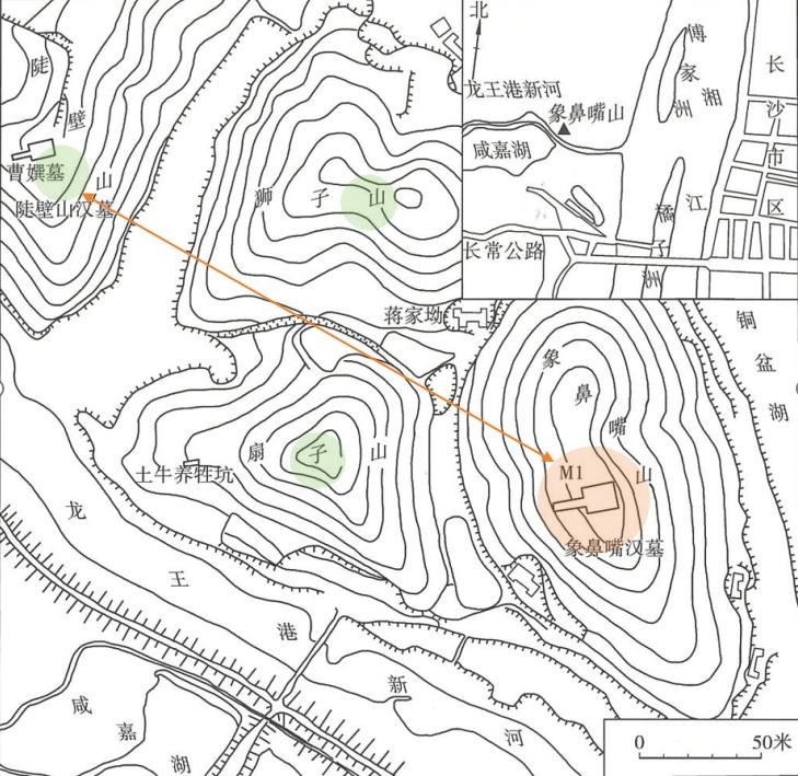 象鼻山的陵墓于1978年发掘,其葬制为黄肠题凑,墓主人是长沙王无疑,从出土的陶器、漆木器、丝织品及玉器推测,可能是末代长沙王吴著。虽然与郑广的判断不同,但我们姑且按照这个判断来定义。象鼻山旁边有狮子山和扇形山两座,经过考古,都有可能是吴姓长沙王墓区。在距离象鼻山200米的徒壁山,1975年也发现西汉早期汉墓,有黄肠题凑,再结合出土“长沙后丞”封泥、鸟篆白文“曹(女巽)”玉印、小篆白文“妾(女巽)”玛瑙印章等物,判断身份是长沙王妃曹氏,因为距离象鼻山很近,结合西汉”王后同茔不同穴“的推测曹氏是应该末代长沙王吴著的王后。其实我有两点疑问,一是吴著的夫人姓氏不清楚吗,如果没有任何记载,只能说明长沙国在当年西汉时期太不重要了。另外,在象鼻山旁边还有扇形山及狮子山两座可能的王(后)陵,而且狮子山距离徒壁山上更近,为什么没有可能扇形山的墓主人是吴著的夫人,而狮子山可能是另外一位长沙王,徒璧山的曹氏是狮子山长沙王的王妃呢。不过,从郑广的研究划分来看,这四座墓都属于同一王陵区,一切都以后发掘再来判定吧。