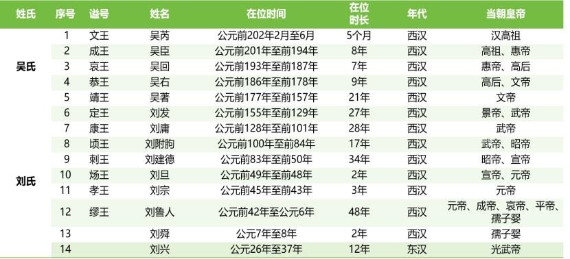 从公元前202年至公元8年,在长达210年的历史之中,长沙国经历了2个姓氏、共13位长沙王的统治。先是汉初的异姓“吴姓长沙王”,后是刘姓长沙王。吴姓第一代王吴芮已经介绍,刘姓第一代王刘发也相当了的。刘发是汉景帝刘启第六子,属于意外中的皇子。传景帝酒后要临幸程姬,程姬正逢月事,命其侍女唐姬侍寝。景帝酒醉,以为是程姬,唐因此怀孕,生下长沙王刘发。但这个出身卑微的皇子并没有受到汉景帝的喜爱,从他所分封的长沙国就可以知道,当时的长沙属于蛮夷之地,而且面临来自南越的威胁。但正是这位不被待见的皇子,却成了东汉皇帝的直系祖先,他是光武帝刘秀与更始帝刘玄五世祖,历史往往就是这么有趣,“汉景帝妃子程姬的一次例假,延续了一个强大的王朝”。下表为历代长沙王在位时间及所处的西汉王朝: