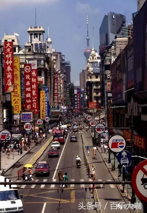 1992年,上海,南京东路与西藏路口东望,左侧近处是中百一店。