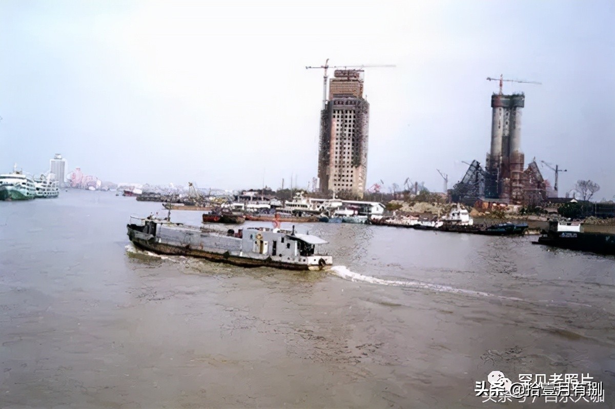 1992年,上海,外滩东望浦东陆家嘴,建设中的港务大楼和东方明珠塔。
