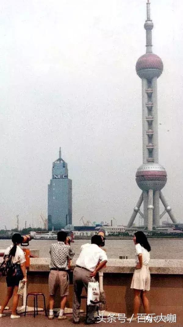 1995年,上海外滩,游客从投币望远镜看浦东东方明珠和港务大厦。