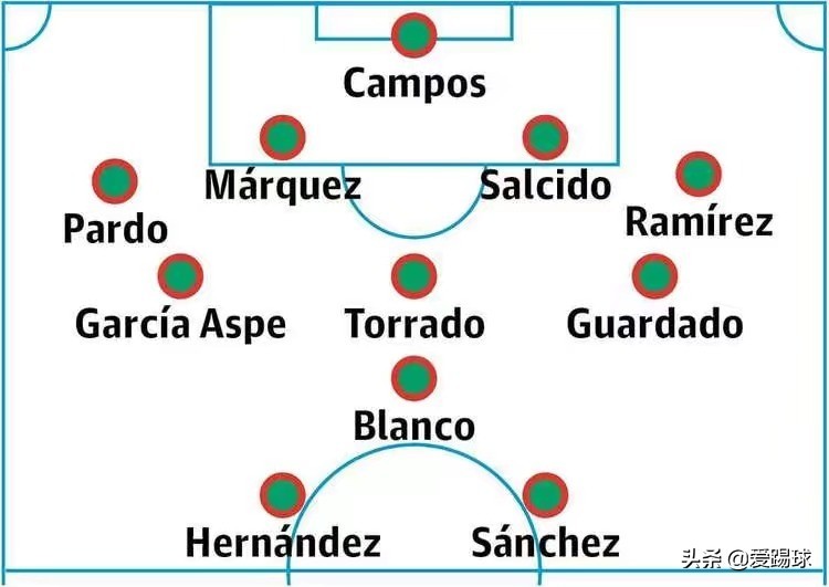 门将:豪尔赫-坎波斯/后卫:帕维尔-帕尔多、拉斐尔-马克斯、卡洛斯-萨尔西多、拉蒙-拉米雷斯/中场:阿尔韦托-加西亚-阿斯佩、赫拉尔多-托拉多、安德烈斯-瓜尔达多/影锋:夸特莫克-布兰科/前锋:哈维尔-埃尔南德斯、乌戈-桑切斯