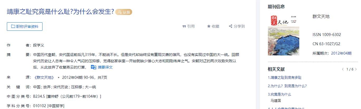 [4]段学义.靖康之耻究竟是什么耻?为什么会发生?[J].群文天地,2012,(04):90-96.
