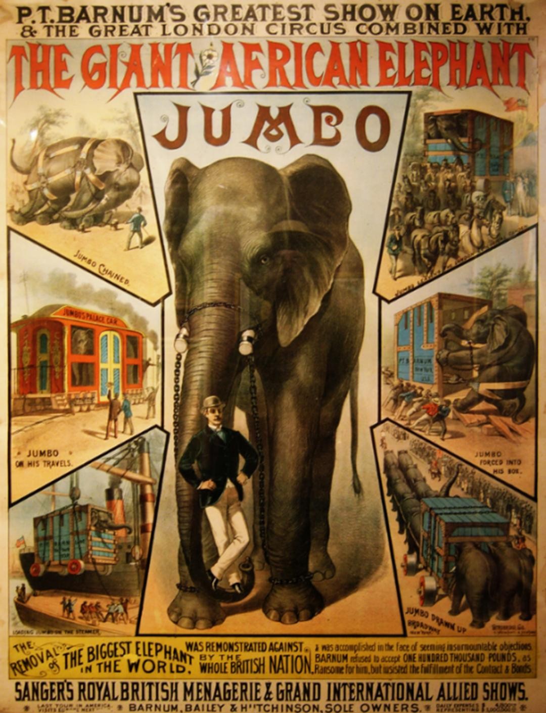 Jumbo的一生很坎坷,它出生在非洲,母亲被猎人杀死后,Jumbo被当成了商品卖到了欧洲,一番辗转之后,他到了伦敦动物园。虽然没有小飞象那样的大耳朵,但Jumbo的体型绝对够大,正好西方人好像对巨大的生物都很感兴趣。在没进到马戏团之前,Jumbo就在伦敦出了名,在当地成了明星一样的存在。