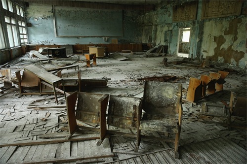 这张图片摄于2015年9月30日,在乌克兰普里皮亚特,一所废弃的学校礼堂里 ,学生们的椅子已经破烂不堪,墙面和地板已经脱皮开裂。这里离切尔诺贝利核电站距离只有几英里,建造于上个世纪70年代,是安置核电站工作人员和家属的地方。