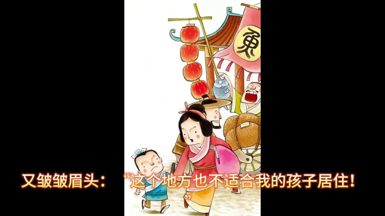孟子的妈妈就带着孟子搬到市集靠近杀猪宰羊的地方去住。到了市集孟子又和邻居的小孩学起商人做生意和屠宰猪羊的事。孟子的妈妈知道了又皱皱眉头:这个地方也不适合我的孩子居住。于是他们又搬家了,这一次他们搬到了学校附近。每月夏历初一这个时候官员到文庙行礼跪拜,互相礼貌相待。孟子见了一一都学习记住。