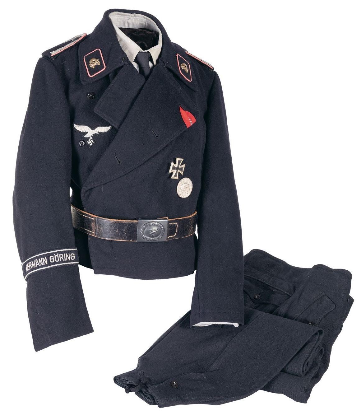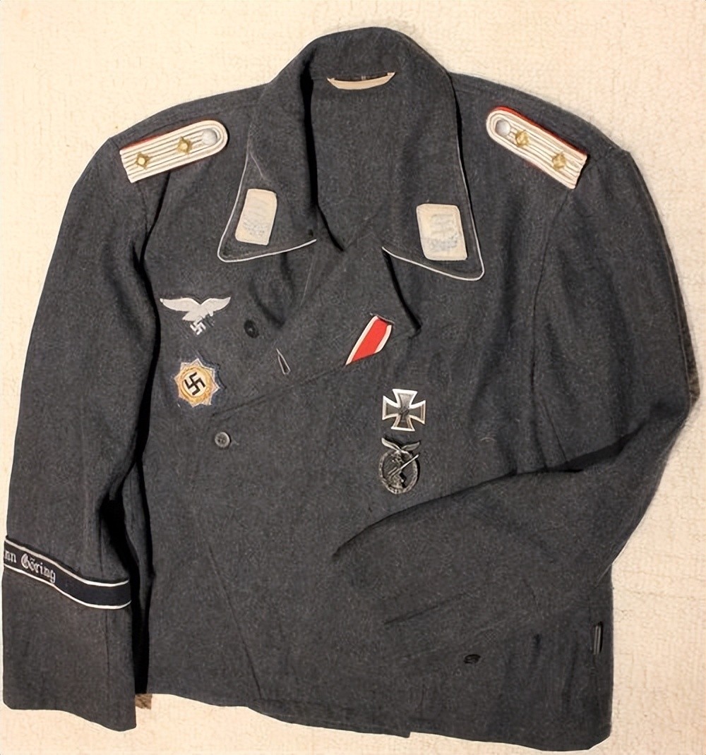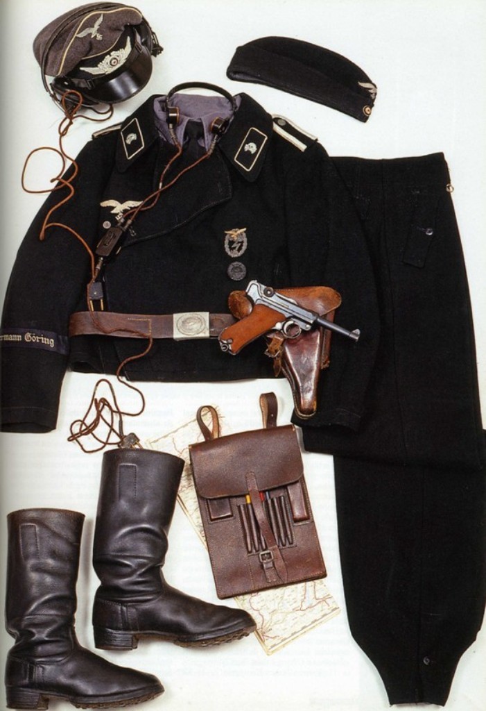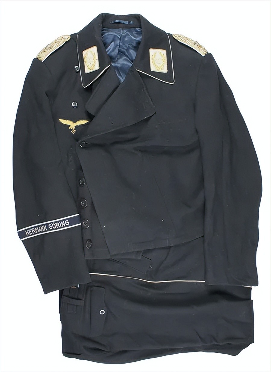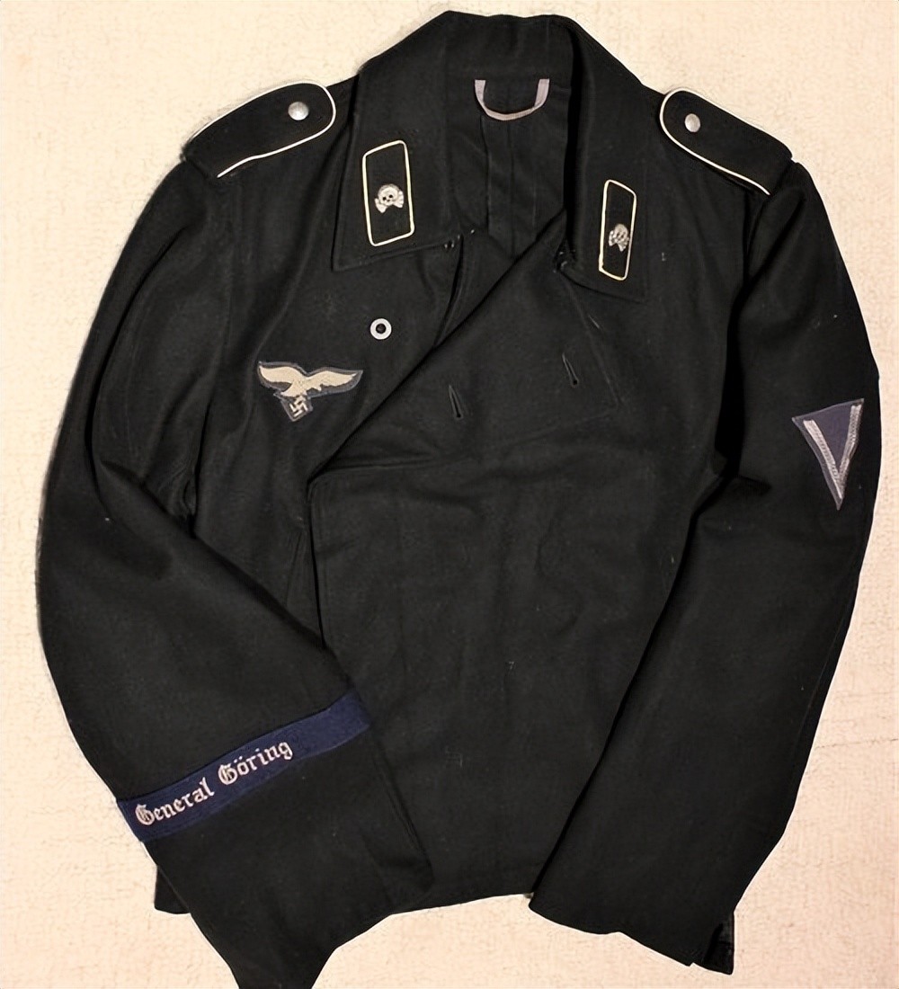 戈林装甲师的黑色装甲兵制服和陆军样式一样,是从陆军被服仓库中直接领取使用的。黑色装甲兵制服由黑色羊毛制成的短腰夹克,双排扣,大翻领,前襟上面两枚纽扣平时打开,作为翻领样式,天冷时可以扣上。左胸口为空军鹰徽,机绣在底布上,最初为蓝灰色,后改为黑色。军官的衣领为银绳镶边,军士和士兵为白绳镶边。