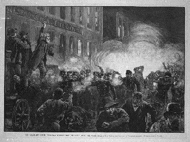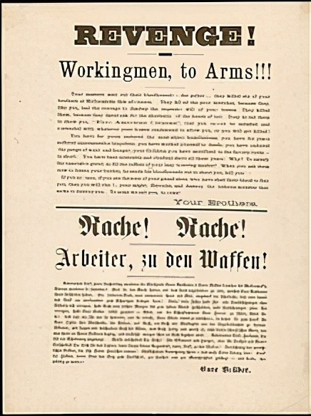 1887年5月3日,工人们举行大罢工的第三天,芝加哥政府当局他们组织罢工破坏者在警察的保护下混进工人的罢工队伍,故意制造混乱,以此为借口,当场开枪打死六个工人。工人遇害的消息传出后,引起了芝加哥全市工人的极大愤慨,工会组织当即号召工人们到市中心抗议。