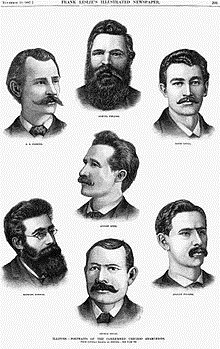 而在被判处死刑的7人当中,有4人于次年被绞刑处死,有1人在执行前自杀,还有两人被改判无期徒刑。在面对死亡时,这四位工人运动的组织者没有表现出任何的懦弱和胆怯,而是在行刑前高唱着《马赛曲》,从容不迫地走上刑场,慷慨就义。