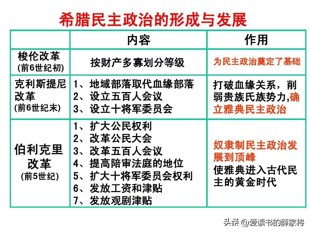 伯里克利改革促使雅典奴隶主民主宪法最后完成,雅典的民主政治得到了发展。