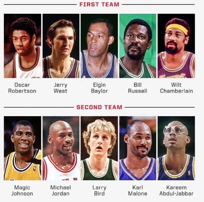一阵:大O罗布特森,杰里-韦斯特,埃尔金-贝勒,比尔-拉塞尔,威尔特-张伯伦。